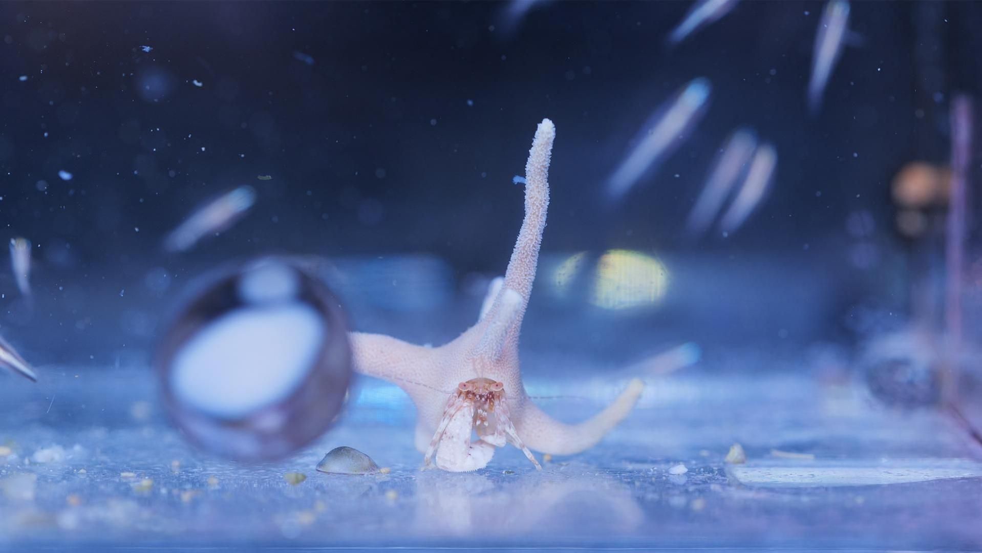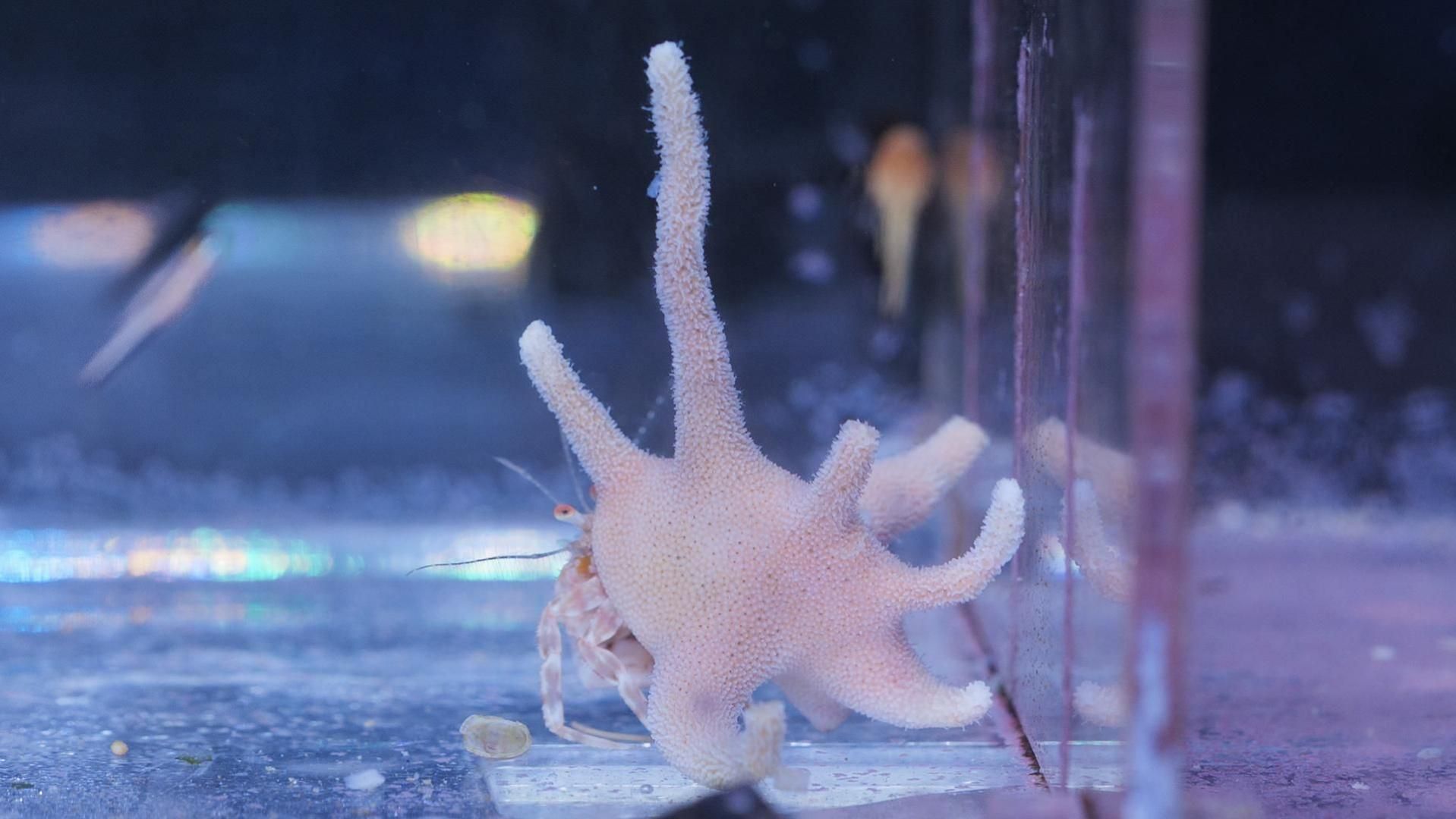 サンゴを背負っている珍しいヤドカリです。